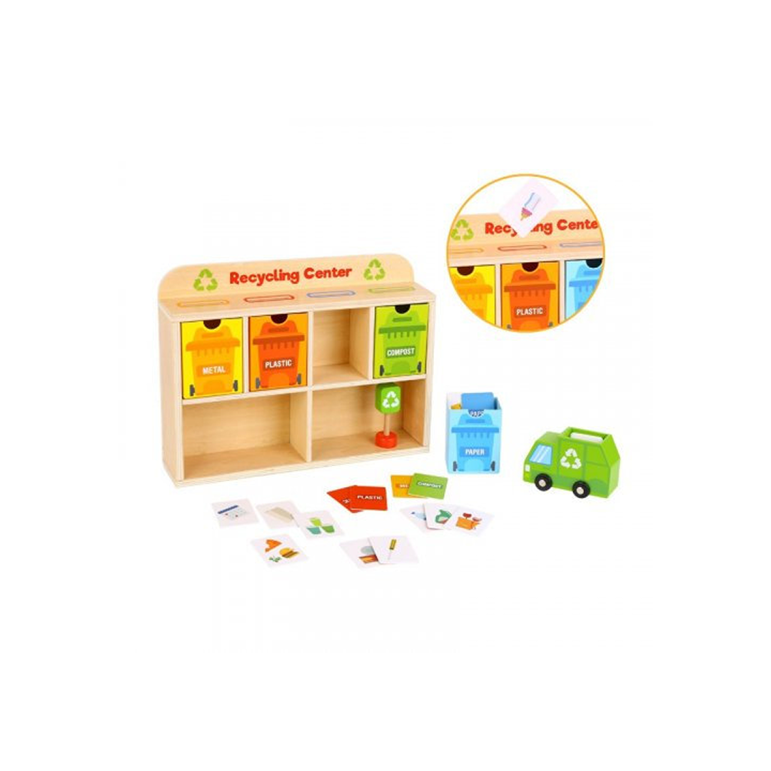 Centrul de recilare din lemn cu 32 de cartonașe cu deșeuri, Tooky Toys